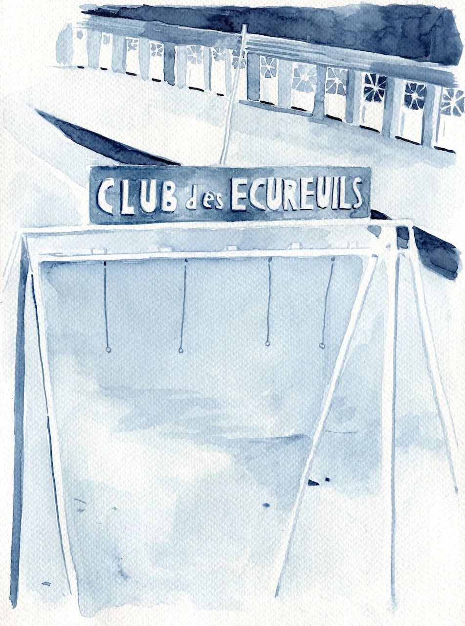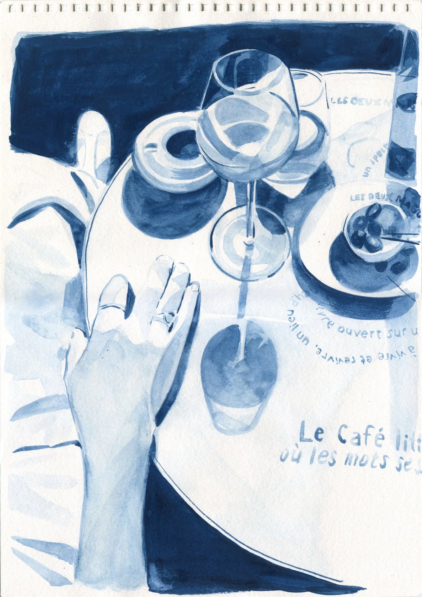 Logan T. Sibrel, “Les Deux Magots (Sketch)”, Gouache on paper, 15.5 x 11 inches, 2025